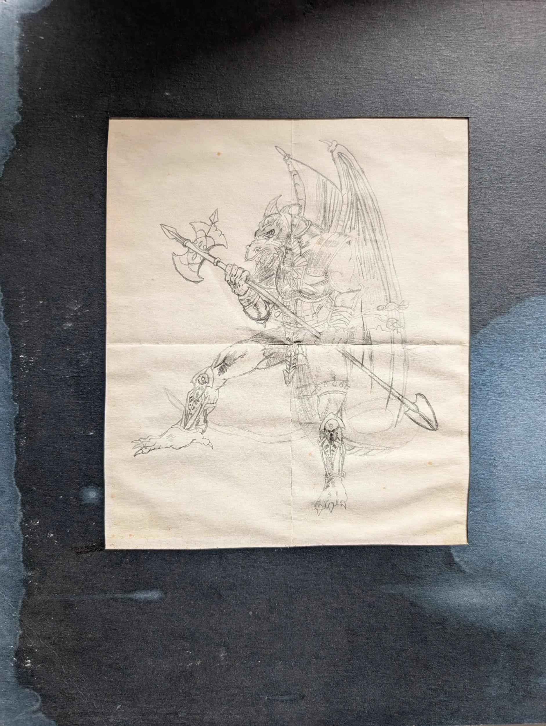 I am currently revisiting this classic trilogy from the 80’s - Dragonlance Chronicles. One of my favorites from back in high school along with David Edding’s The Begariad, and The Malorian. There’s only time for 1 to 2 pages at night before I pass out, but I’m determined. Dragonlance inspired many drawings of mine back in high school, as well as my first AD&D character. Here’s a drawing I found recently, albeit it is a bit worse for wear with water damage after being salvaged from a fire 26 years ago.
